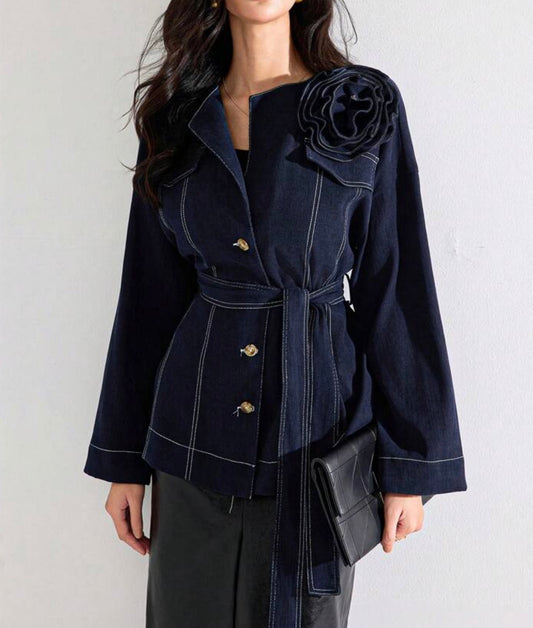 Navy Blue Denim Jacket with Scallop Detail