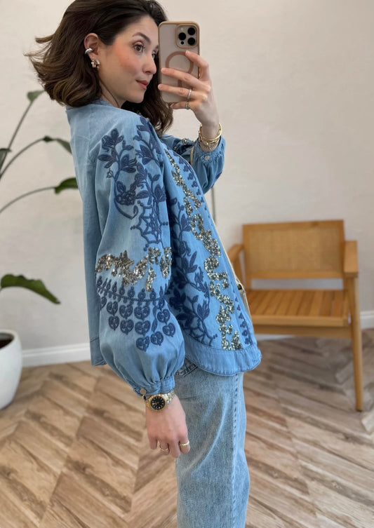 Long Denim x Crep Blouse with Gold embroidery